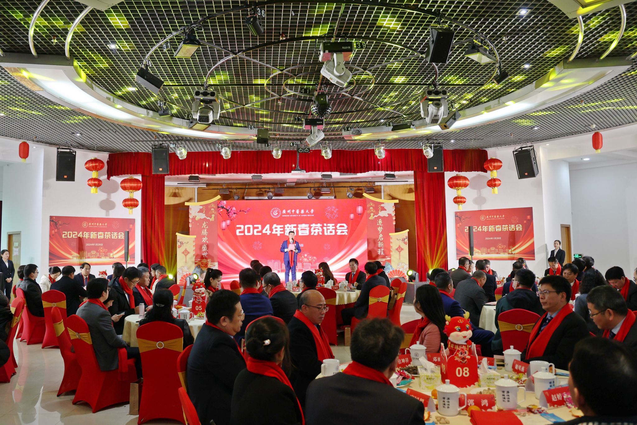 On January 26, Guangzhou University of Chinese Medicine held a New Year tea reception at the staff activity center at the university town campus. Leaders of the university, academicians, representatives from affiliated hospitals, representatives from university-local co-construction hospitals, leaders of university party andadministrationdepartments,leadersof secondary units, representatives of retired faculty and staff, representatives of democratic parties, teacher representatives, student representatives, and representativesoffront-lineworkersinservice departmentsgathered together to welcome the 2024 ChineseNew Year. Chen Wenfeng,Secretary of the CPC GZUCM Committee, attended the reception and delivered a speech. Liu Liang, academician of the Chinese Academy of Engineering,Professor Xu Nenggui,chiefscientist and Qihuangscholar,andsomeothersalsoparticipated. Thereceptionwas presided over by Qiu Yahong, DeputySecretary of the CPC GZUCM Committee.