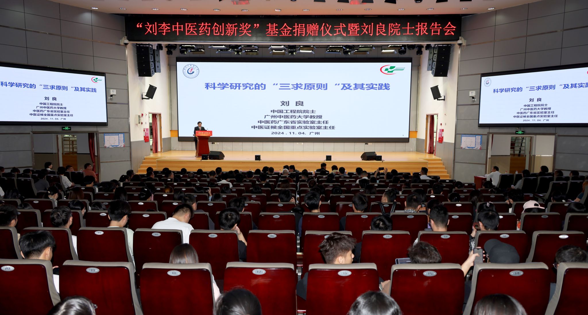 11月4日上午,“刘李中医药创新奖”基金捐赠仪式暨刘良院士报告会在大学城校区国际会议厅举行。中国工程院院士刘良教授及夫人李展如女士,学校党委书记陈文锋,党委副书记、校长王伟,副校长潘华峰,刘良院士团队成员,学校相关职能部门负责人,第二附属医院负责人以及研究生、本科生代表共计500余人参加了活动。学校党委副书记邱亚洪主持基金捐赠仪式。