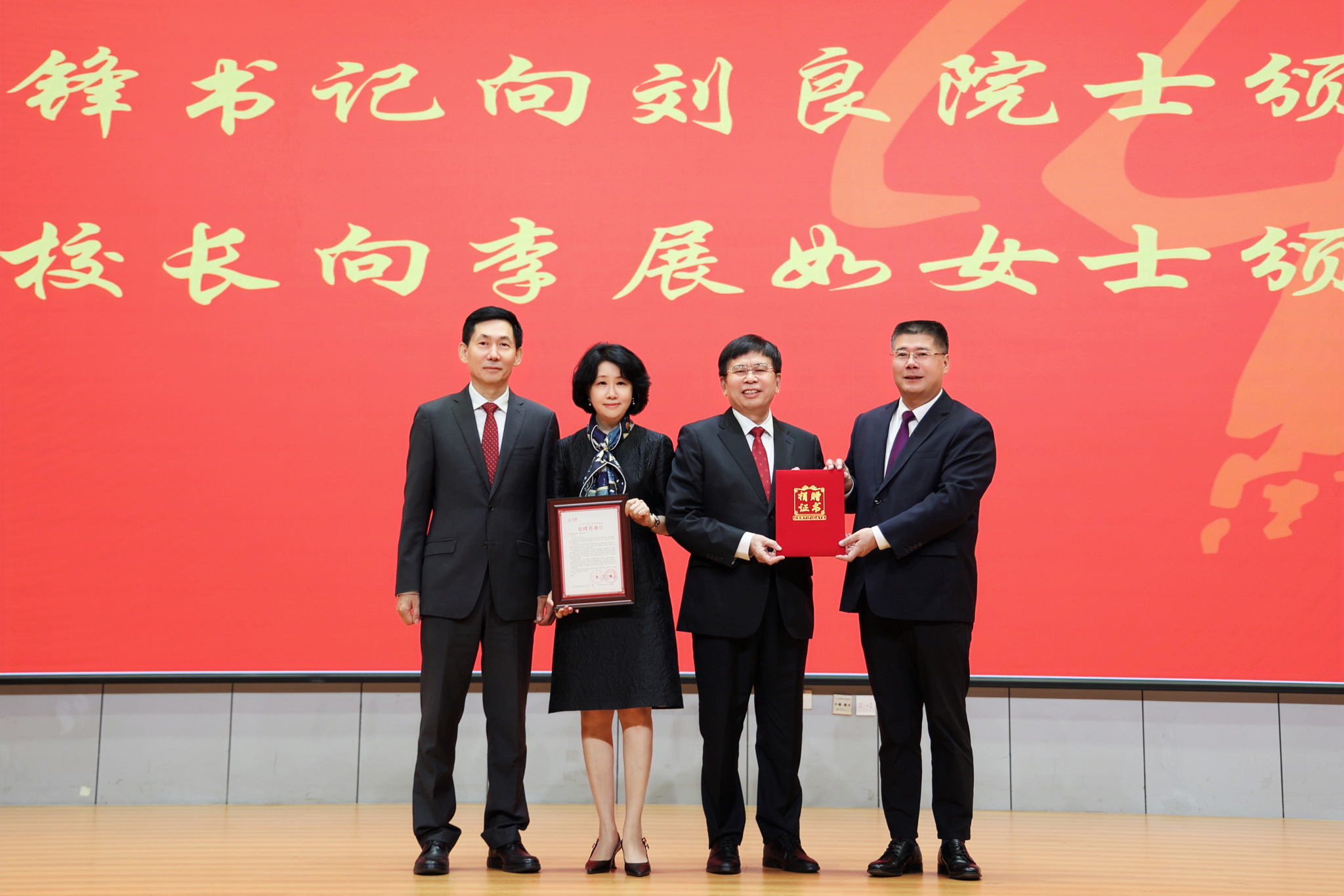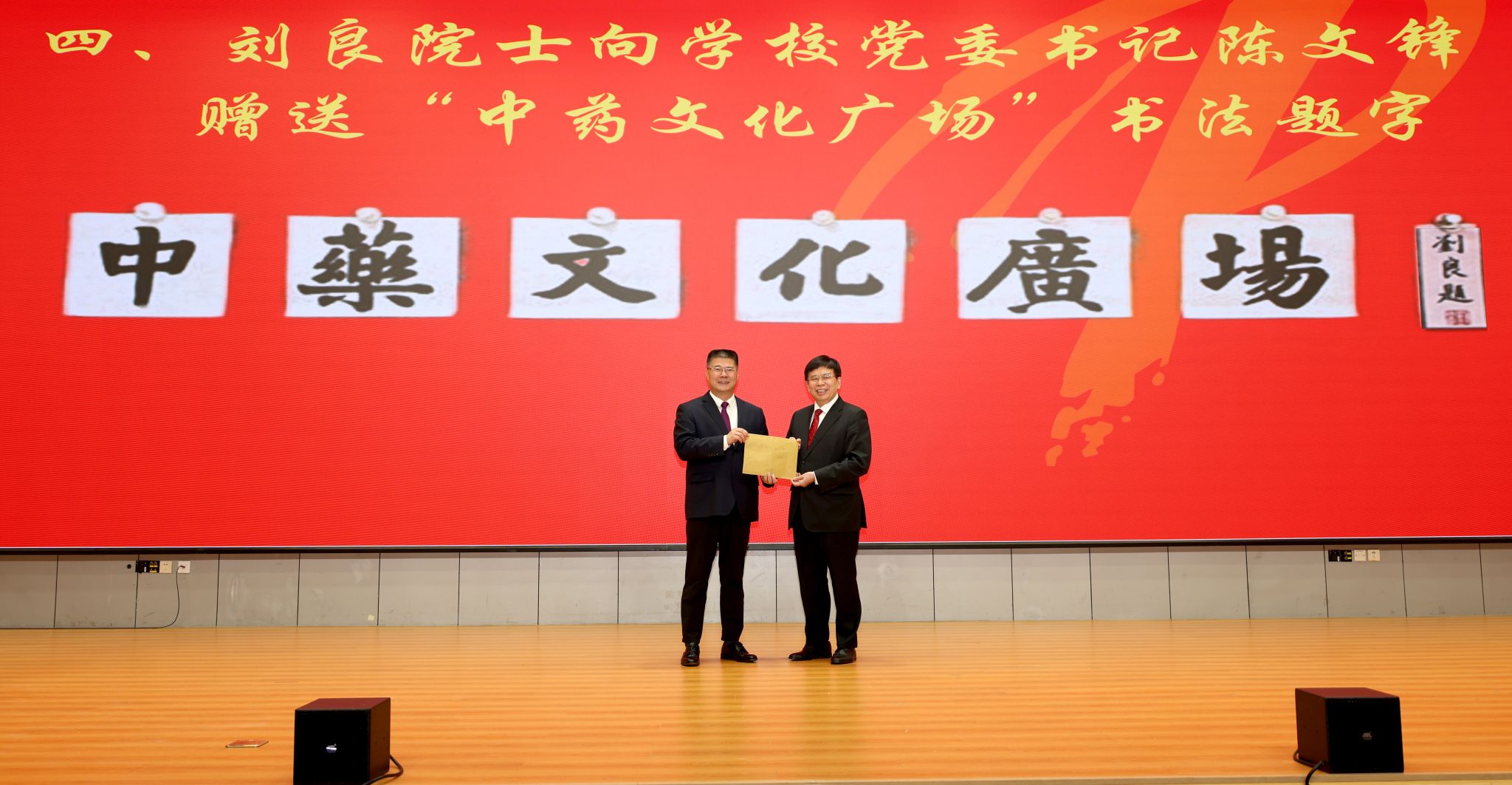 刘良伉俪现场向学校捐赠100万元设立“刘李中医药创新奖”基金,并向学校赠送“中药文化广场”书法题字。陈文锋代表学校接受捐赠,王伟代表学校签署了捐赠协议。陈文锋、王伟分别向刘良、李展如颁发捐赠证书和感谢信。