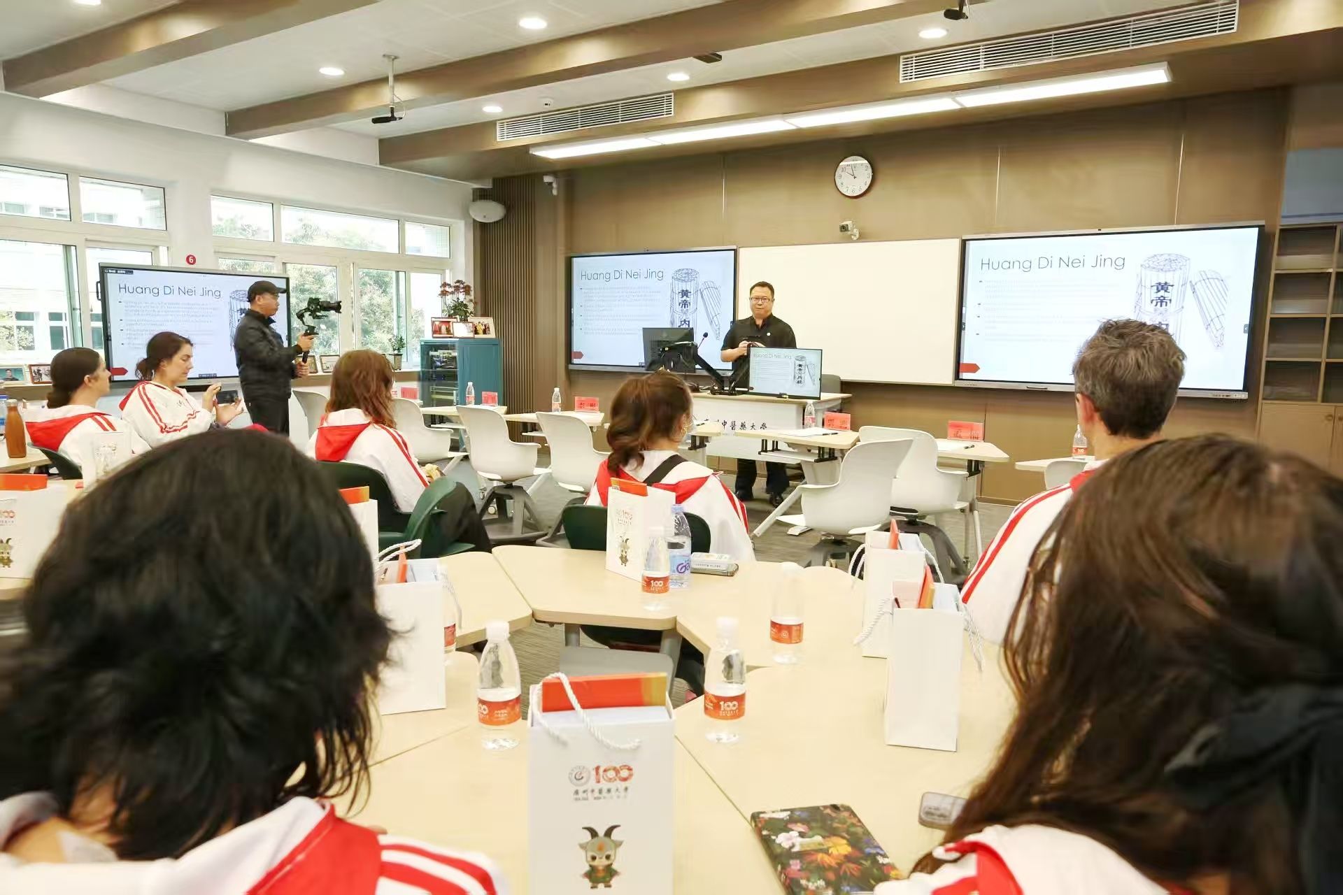 开营仪式结束后,ac米兰官网中文网站基础医学院张小虎副教授为交流团讲授中医药主题课程。深入讲解了《黄帝内经》所蕴含的整体观思想,让加拿大师生领略到中医药独特的思维方式和深厚的文化内涵。