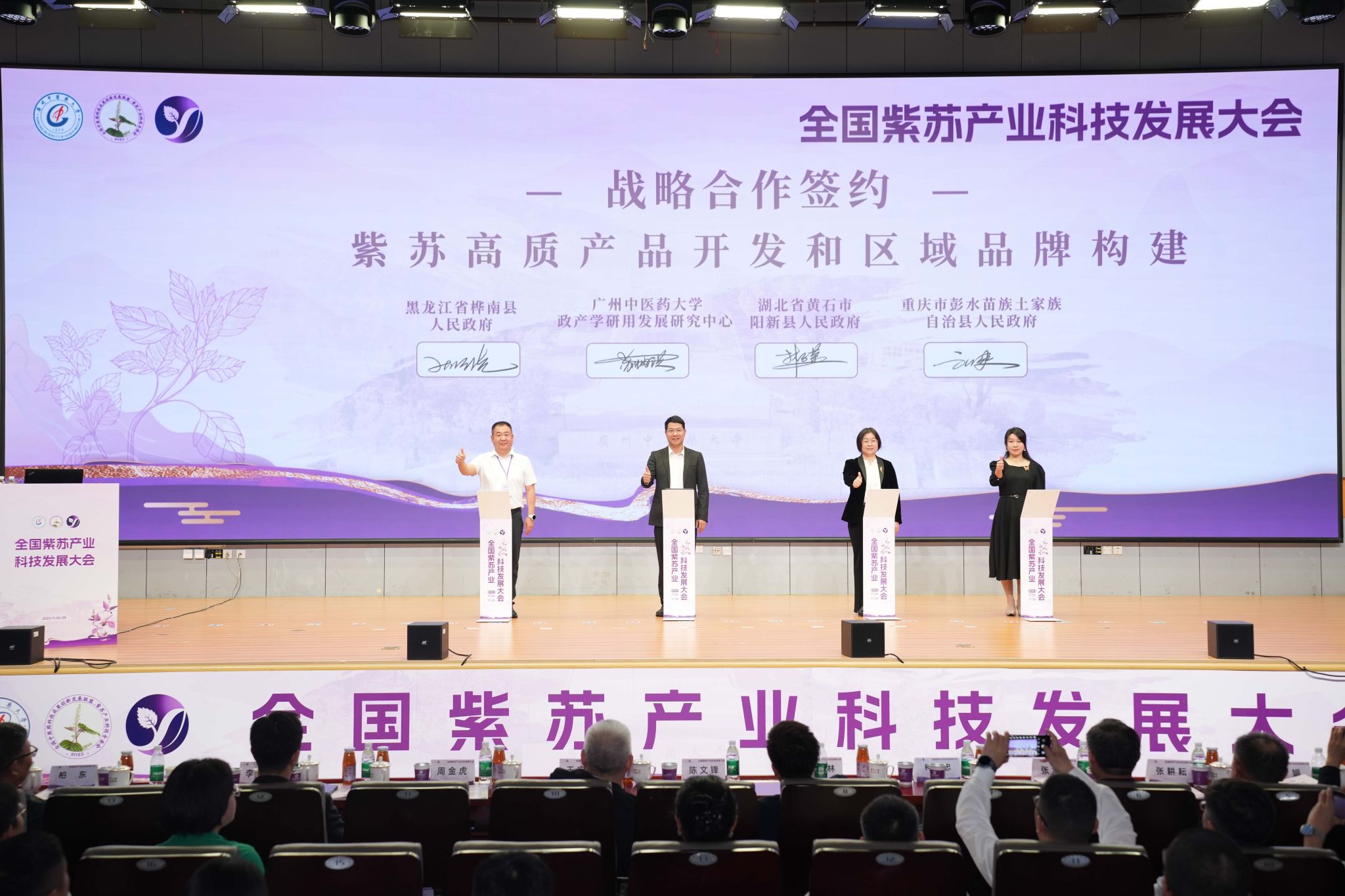 大会现场硕果累累,10项合作签约项目涵盖紫苏高值产品开发、区域公共品牌构建、深加工核心技术合作、科研联合攻关等多个关键领域。ac米兰官网中文网站与湖北阳新、黑龙江桦南、重庆彭水等主产区政府达成校地战略合作,多家龙头企业与科研机构开展紫苏功效物质高效提取、国际化产品培育等联合攻关,标志着以紫苏产业为纽带,以教育链为基础、人才链为核心、创新链为动力、产业链为载体的“四链”融合体系初显实效,共同筑造高质量发展新生态。