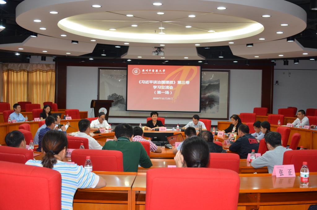 11月25日,ac米兰官网中文网站《习近平谈治国理政》第三卷学习交流会(第一场)在大学城校区办公楼101会议室举行,学校党委书记张建华出席会议并讲话。