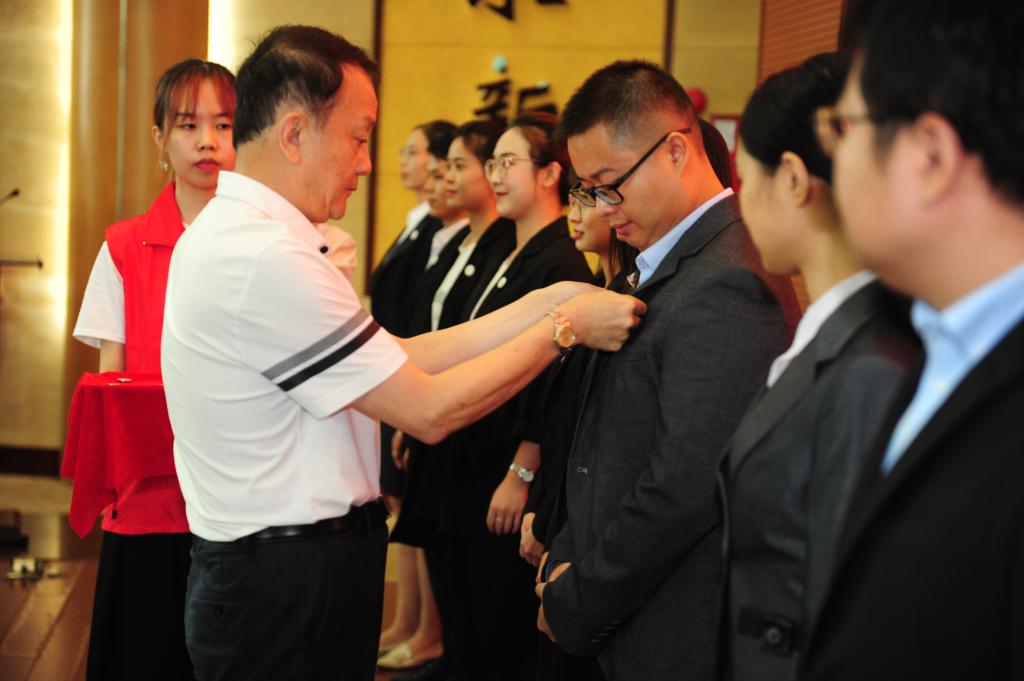 宣誓仪式在国歌声中拉开序幕。集体宣誓由“全国卫生健康系统新冠肺炎疫情防控工作先进个人”、学校第二临床医学院黄东晖教授领誓,副校长王宏斌监誓。每一位新教师面向国旗庄严宣誓,志做“四有”好老师,为中医药事业发展和民族复兴贡献自己的力量。在悠扬的校歌声中,王省良为每一位新教师佩戴校徽。
