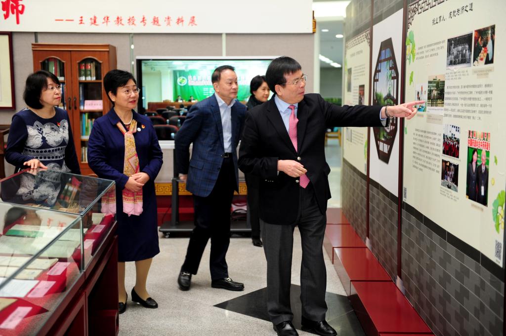 上午9时,刘良在学校党委书记张建华、校长王省良陪同下,来到图书馆一楼大厅参观“筚路蓝缕 杏林先师”王建华教授专题资料展。王建华教授是刘良在硕士、博士阶段的导师,终身教授、首席教授,享受国务院特殊津贴。展览涵盖了王老的生平和成就,陈列了王老的手稿、工作证件、办公用品以及国家科技二等奖奖状等物品。刘良不时驻足观看,睹物思人,感怀恩师,深情回忆师生往事。