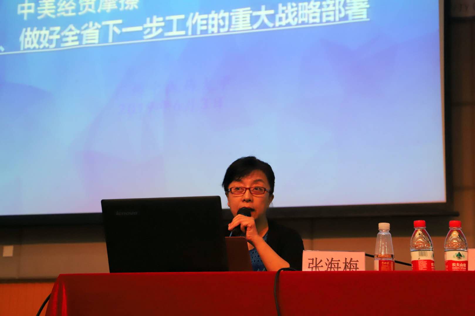 张海梅教授就2018年国家和广东省经济运行总体情况、当前中美贸易摩擦产生的原因和特点、如何以习近平总书记对广东重要讲话和重要批示精神统领广东全局工作三个方面作了报告。报告用事实和数据对改革开放40年以来,特别是党的十八大以来广东的发展取得的成就,显示广东经济稳中向好、韧性强、潜力足、预期好的良好发展态势。报告简要回顾了当前中美经贸摩擦的节点,剖析中美经贸摩擦的根源和实质在于遏制中国的发展,是美国不愿看到中国的发展壮大,想极力维护自己的长期霸权地位和所谓的战略优势,阐释在中美经贸摩擦中我国的立场及应对措施。报告正确认识我国发展的重要战略机遇期,理性看待中美经贸摩擦,强调要始终坚持以习近平新时代中国特色社会主义思想为指导,用习近平总书记对广东重要讲话精神统领广东全局工作,积极落实省委“1+1+9”工作部署,坚定信心,超前谋划,精准应对,稳定预期,化压力为动力,加快改革开放步伐,不断巩固经济平稳发展的基础,为我省实现“四个走在全国前列”、当好“两个重要窗口”作出更大贡献。