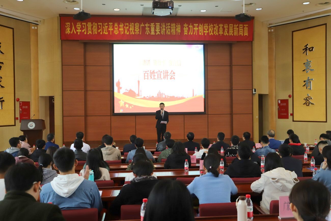 1月7日上午,由广东省委宣传部、广东省委教育工委主办,我校承办的广东省庆祝改革开放40周年“学讲话 讲故事 强自信”百姓宣讲会在我校举行。广东省委宣传部副部长杜新山,省委教育工委副书记,省教育厅党组副书记、副厅长邢锋,学校党委副书记、纪委书记白建刚等领导出席。来自广东工业大学、广东外语外贸大学、广东药科大学、广州大学以及我校的学生200余人现场聆听了故事宣讲。