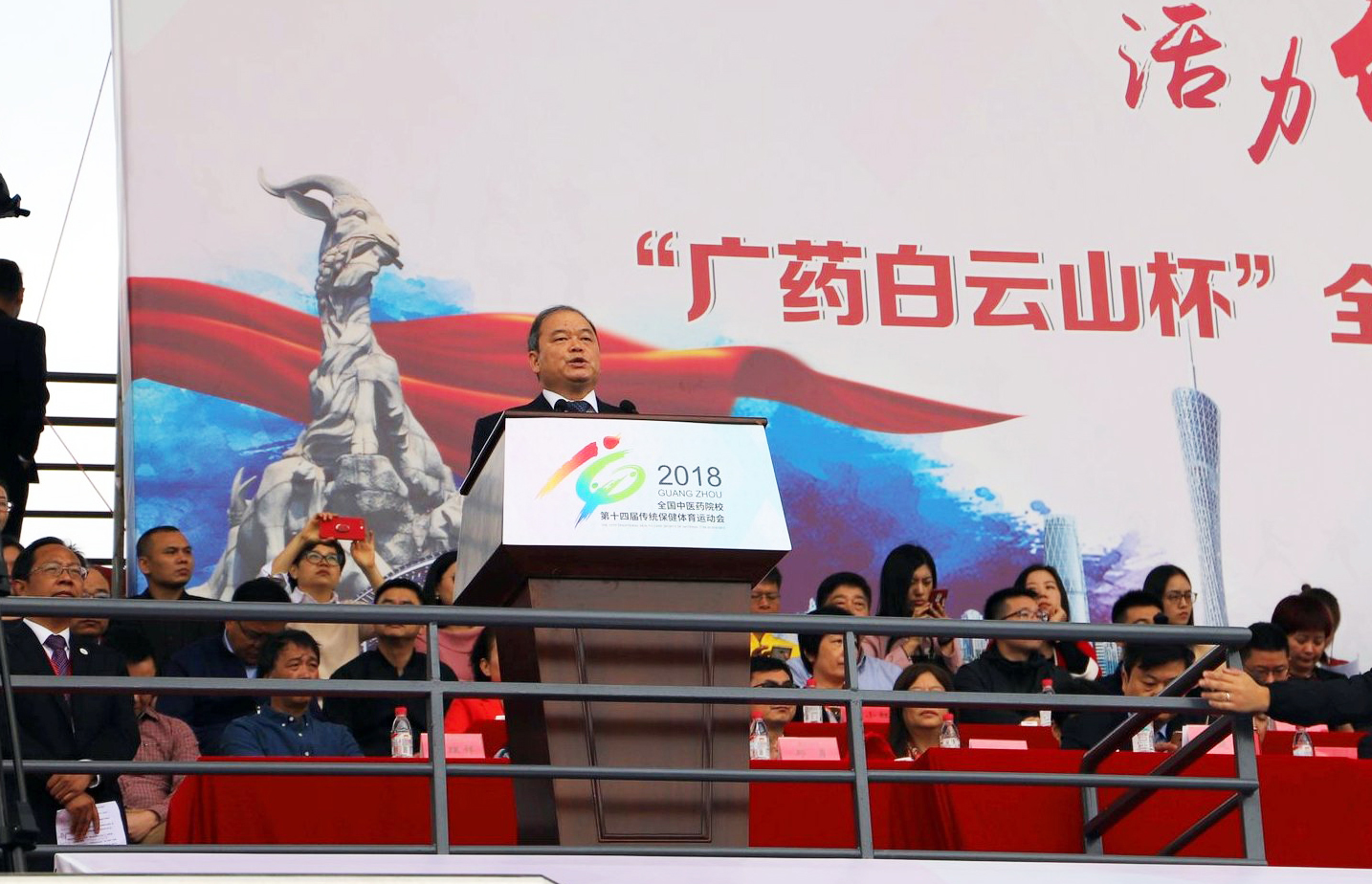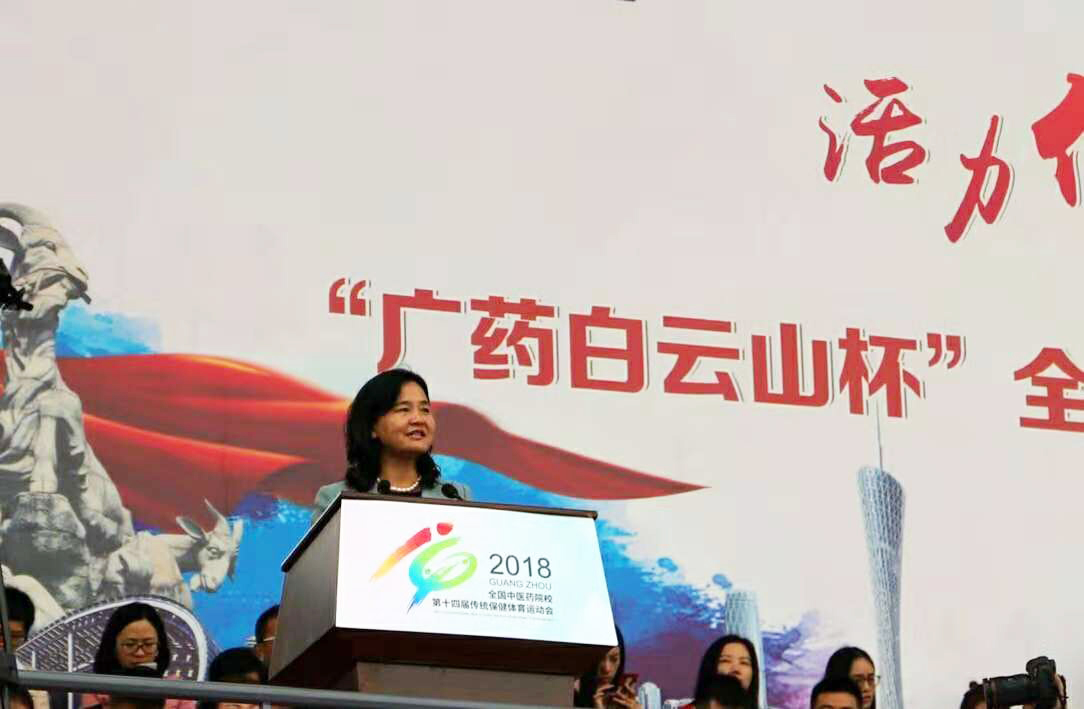 11月19日上午,全国中医药院校第十四届“广药白云山杯”传统保健体育运动会在我校大学城校区隆重举行。国家卫生健康委员会党组成员、国家中医药管理局党组书记余艳红,广东省人大常委会副主任、党组成员黄业斌,全国中医药高等教育学会传统保健体育研究会理事长、北京中医药大学党委书记谷晓红,国家中医药管理局人事教育司副司长张欣霞,广东省教育厅副巡视员邱克楠,中国武术协会副主席、广东省武术协会主席田新德,广药集团党委书记、董事长李楚源,以及参赛的中医药院校领导出席了开幕式。