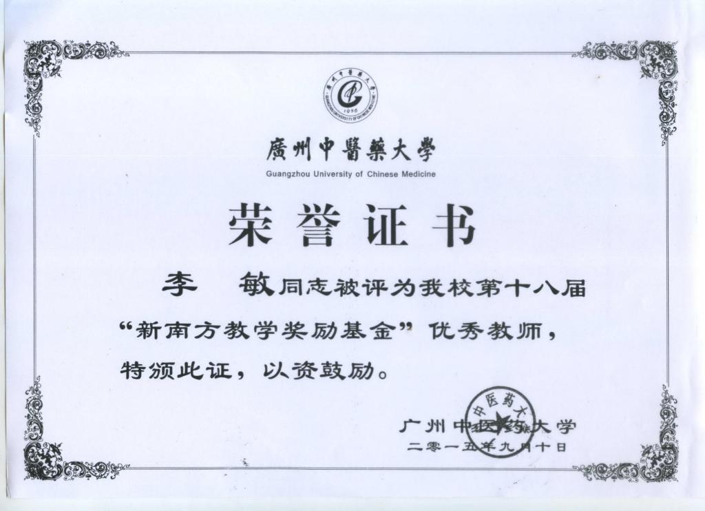 2015年荣获ac米兰官网中文网站第十八届“新南方教学奖励基金”优秀教师