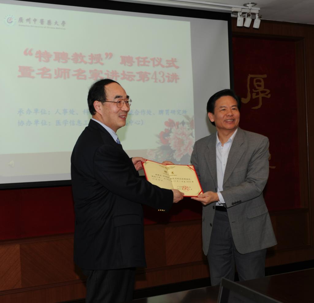 12月15日下午,美国马里兰大学医学院讲座教授汪建英先生受聘为我校“特聘教授”,校领导王省良、孙晓生、陈蔚文以及资深中医脾胃病专家劳绍贤、周福生、王汝俊教授等出席聘任仪式。