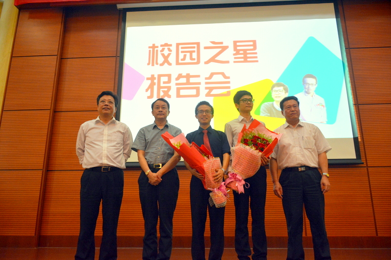 学校党委书记黄斌在主持报告会时指出,两位"校园之星"用执著的追求、不懈的努力和成功的实践,诠释了当代优秀大学生的丰富内涵,是引领广大青年学生健康成长、全面发展的生动榜样。创新创业已经成为时代最强音,希望同学们把准时代脉搏,在全面提升自己综合素质的基础上,努力培养创新精神和创新能力,主动接受创业教育,大胆开展创业实践,以创新创业的实际行动托起中国梦。