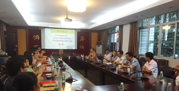 近日,校领导黄斌、王省良、陈英华、许能贵在三元里校区召开会议,表彰我校在全国中医药院校2014皇甫谧杯针灸推拿临床技能竞赛获奖的全体师生。教务处和针灸康复临床医学院领导和专家组教师代表、工作组教师代表和参赛的师生参加了表彰会。
