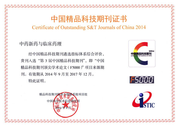 《中药新药与临床药理》同时入选"中国精品科技期刊顶尖学术论文(F5000)"项目来源期刊,本刊12篇优秀论文入选领跑者5000——中国精品科技期刊顶尖论文。中国精品科技期刊顶尖学术论文(F5000)是从315家中国精品科技期刊近5年发表的论文中评选出"领跑者5000——中国精品科技期刊顶尖学术论文"(每年评选一次),集中展示和交流我国的顶尖学术论文,通过"领跑者5000——中国精品科技期刊顶尖学术论文平台(F5000)"与国际和国内重要检索系统链接,并利用WOK国际检索平台与SCI数据库在同一平台内实现链接和国际引文检索,向世界和科技界同行展示和推广我国最重要的科研成果,扩大中国学术期刊和出版机构的国际影响力。