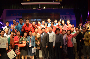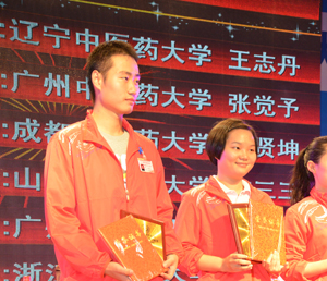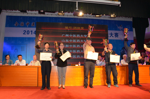 我校代表队与中国针灸学会会长合影 我校领队梁沛华处长领取团体冠军奖杯