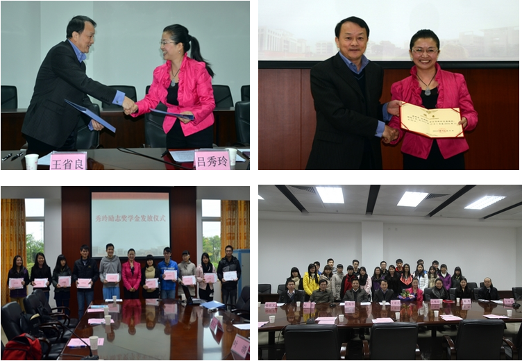 王省良与吕秀玲签署了秀玲励志奖学金捐助协议,并为吕秀玲董事长颁发了我校客座教授聘书。吕秀玲为20位获奖学生现场颁发了证书及奖学金,希望同学们自强自立,真诚做人,提高个人素质,毕业后用自己所学专业知识回报学校、回报社会。