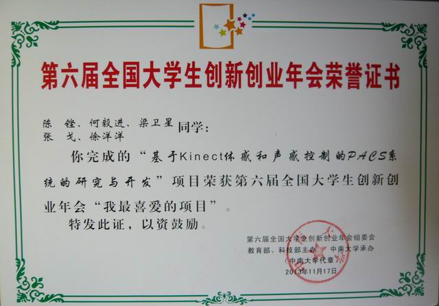 我校参展项目是从全国的516个展示项目中,经过专家两轮双盲评审入选本次年会的120个展示项目,又从120个展示项目中脱颖而出,最终被评选为十大"我最喜爱的项目"。该项目开发了一款基于微软Kinect人机交互传感器的应用—iPacsKinect,它改变鼠标和键盘带菌的传统人机交互操作方式,可以让工作人员通过手势或声音控制医学影像诊断界面,获得了国家版权局计算机软件著作权登记证书,并被评为我校2012年度广东省大学生创新实验计划优秀项目。