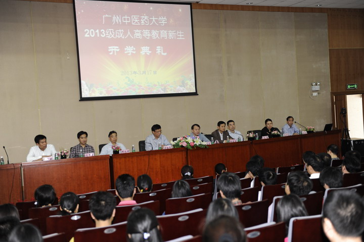 3月17日下午,我校成人高等教育2013级新生开学典礼在三元里校区隆重举行。广东省中医药局副局长李梓廉,我校校长王省良、副校长许能贵、校办主任林辉、教务处副处长陈贤春以及各二级学院领导和1800多名成教新生参加了开学典礼。开学典礼由继续教育学院黄水清院长主持。