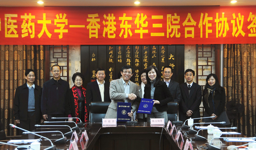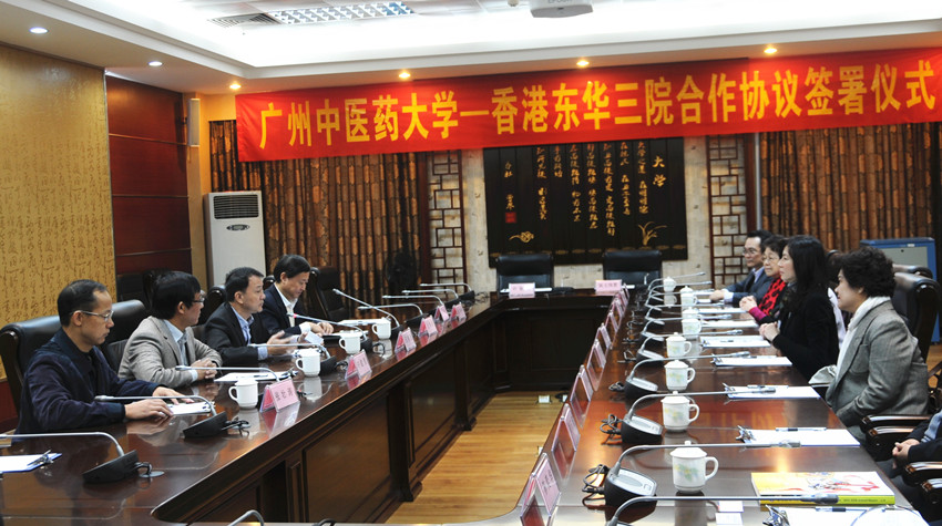 我校王省良校长与代表团一行亲切会谈,并希望双方在过去的基础上,互相学习,将合作进一步深化。双方约定开展中医药临床、科研、教学方面的交流与合作,以互派专家、学者进修与访问,合办学术及医疗研讨会等方式,加强粤港中医药的交流与合作,共同促进两地的中医药事业发展。 许能贵副校长代表我校与对方签署了合作协议。
