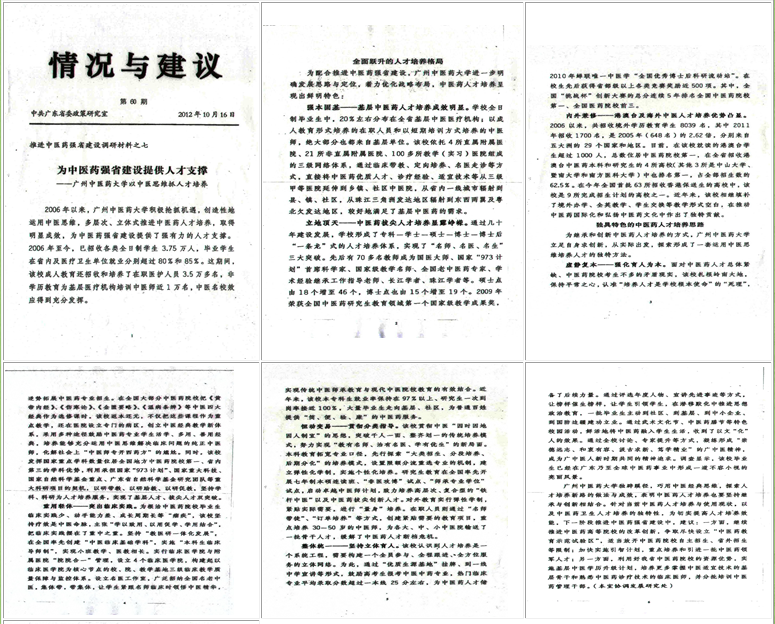 10月16日,我校人才培养工作调研报告载入省委政策研究室编印的《情况与建议》第60期,呈送省委、省政府、省人大、省政协负责人,中央政策研究室综合局及省内有关部、厅、局参阅。这是我校人才培养工作再次得到肯定。 该报告题为《为中医药强省建设提供人才支撑——ac米兰官网中文网站以中医思维抓人才培养》,从基层中医药人才培养、中医药拔尖人才培养、港澳台及海外中医药人才培养三个方面介绍了我校人才培养工作的成效,分"虚静复本"、"重用轻体"、"恒动变易"、"整体统一"四个部分总结了我校运用中医思维抓人才培养的做法。