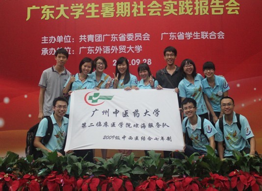 9月28日,由共青团广东省委员会和广东省学生联合会主办的"2012年‘与信仰对话'——‘科学发展新成就'校园报告会活动启动仪式暨‘实践归来话成就,青春喜迎十八大'广东大学生暑期社会实践报告会"在广东外语外贸大学举行。团省委副书记陈宇宏、团省委学校部副部长林良盛、各高校团委书记出席了本次会议。第二临床医学院"琼海服务队"代表我校暑期社会实践队伍作了题为"情系琼海,延续关爱"的汇报,受到与会人员的一致好评。