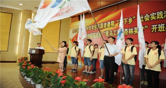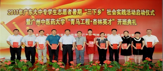 7月14日上午,2011年广东大中专学生志愿者暑假"三下乡"社会实践活动启动仪式暨ac米兰官网中文网站"青马工程•杏林英才"开班典礼在我校办公楼学术报告厅召开。学校党委书记黄斌、广东省委宣传部副巡视员杨群祥,团省委副书记曾颖如,学校党委副书记陈英华,团省委学校部部长张文杰、副部长张晓莉,省学联执行主席胡伯阳,学校各职能部门的主要负责人以及来自广东省各兄弟高校的团委干部和"青马工程•杏林英才"的首批导师团出席了本次活动。