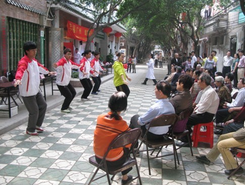 另讯,4月10日上午,在北京街综合服务中心门前开展了我校第一期"幸福广州,健康同行"活动,进行了八段锦表演、培训,饮食讲座,健康咨询与中医传统疗法义诊等活动,街道群众反响强烈,参与同学获益良多!