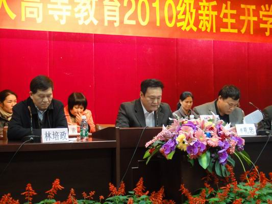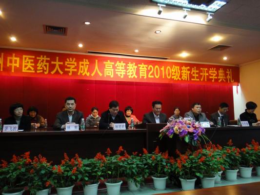 3月7日下午,我校成人高等教育 2010 级新生开学典礼在三元里校区隆重举行。会议由林培政副校长主持。学校党委黄斌书记、广东省中医药局曹礼忠副局长出席会议并致辞。广东省中医药局科教处李梓廉处长及我校相关职能部门、二级学院的领导和近1500名成教新生出席了大会。