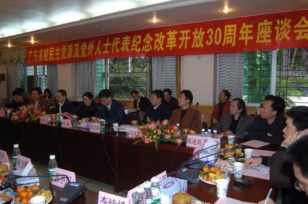 2008年12月29日上午,广东高校民主党派、党外人士代表纪念改革开放30周年座谈会在我校召开,会议由广东省委教育工委组织处处长吴琦琳主持。省委教育工委副书记(正厅级)谭泽中,省委统战部副巡视员袁伟英,我校党委书记黄斌、副校长刘晟莅会指导。省委统战部党外知识分子工作处处长张宏斌、省委教育工委组织处副处长冯成志、我校组织部部长古展群以及广州地区22所本科院校统战部部长,各校民主党派和党外人士代表等60余人参加了会议。