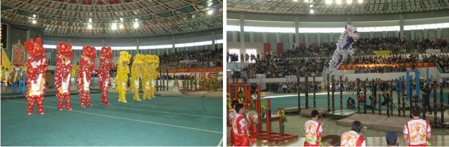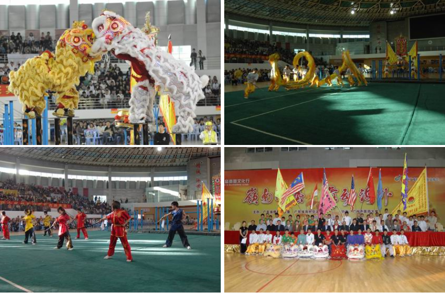 来自马来西亚、美国、印尼和香港以及省内湛江文车龙狮团和佛山黄飞鸿龙狮团等6支队伍同台竞技,汇演的节目包括:金鼓齐鸣、群狮齐舞、高桩舞狮、舞龙表演等。这些都是目前世界上高桩舞狮技艺较精湛的队伍,多次荣获世界高桩舞狮大奖。湛江文车龙狮团和佛山黄飞鸿狮队都曾代表广东参加国际文化节的表演,湛江文车龙狮团8月参加北京奥运会开幕式表演载誉归来。我校学生还进行了武术表演,获得满堂喝彩。