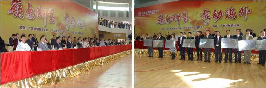 同时,为更好整合省内资源,形成面向海外侨胞、各具地方特色的中华文化传承服务体系,省侨办吴锐成主任、教育厅谭泽中副书记、文化厅杨伟时副巡视员和省旅游局于非己处长还为第二批广东省中华文化传承基地授牌。我校广东中医药博物馆成为传承基地之一,并代表各基地讲话。黄斌书记在讲话中表示,有中国第五大发明之称的中医药,一路呵护着中华民族走过几千年,具有明显的中华民族文化的印记。在当今经济日趋全球化和世界文化多元化格局的形势下,愈加凸显其现代价值。我们将充分发挥作用,积极向海外推介中医药文化,为传播中华文化、提高中华民族凝聚力而努力奋斗!