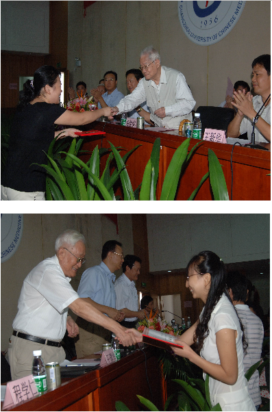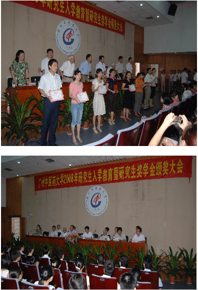 在欢乐的音乐声中,92岁高龄的邓老亲自为获得"邓铁涛非医攻博优秀研究生奖学金"的研究生颁奖,设奖企业代表与学校领导分别为获得"一方优秀研究生奖学金"、"仲景优秀研究生奖学金"的40名研究生颁奖。获奖代表、研究生新生代表分别在会上发言,表示一定珍惜学校提供的机会,努力学习,开拓创新,不辜负老一辈中医药专家和学校领导的期望与重托。