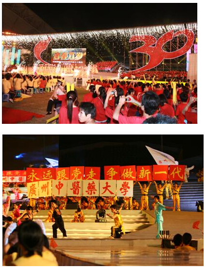 5月4日晚上,由共青团广东省委、共青团广州市委、广东省青年联合会、港澳青年联合会、广东省音乐家协会、广东省流行音乐协会等联合举办的"《青春万岁》•粤港澳青年纪念改革开放三十周年"大型歌会在广州大学城体育馆隆重举行。我校党委孙晓生副书记出席了晚会,学校团委选派了合唱、舞蹈、武术类共500多名同学参加这次歌会的演出,组织600多名同学现场观看了表演。