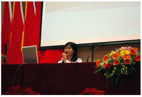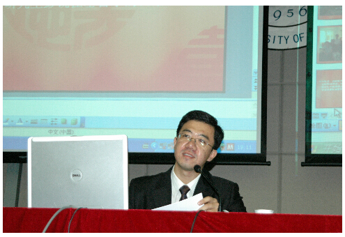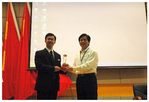 在报告会开始前,校党委副书记孙晓生首先为彭锐同学补颁了"2006年度校园人物"奖杯并发表了热情洋溢的讲话。孙副书记在讲话中指出,两位同志用自己的聪明智慧和辛勤汗水,在对外医疗志愿活动中取得了优异成绩,为国家、为广州、为学校增添了光彩,为中医药走向国门作出了贡献。他们的成绩再一次充分说明了中医药的生命力,也再一次证明了我校教育教学的成功,希望广大学生能以他们为榜样,努力学好专业知识,立志成为中医药事业的栋梁之才。
