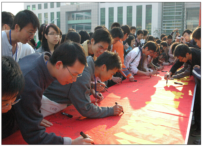 学校徐志伟校长为学生督察队授旗后,校领导带头在"ac米兰官网中文网站争创一流学风、教风、校风"签名红绸上庄严签名,接着参会的上万名师生员工陆续签名,拉开了我校"争创一流学风、教风、校风"活动的序幕。本次活动将维持3个多月,期间将举办包括师德宣传教育活动、学风建设活动在内的一系列活动,在广大教师中通过深入学习胡锦涛总书记在接见全国道德模范及在全国优秀教师座谈会上发表的重要讲话,开展"师德建设"征文、"师德标兵"、"师德建设先进集体"评选、"师德师风"建设演讲比赛等活动,在全校掀起学先进模范、树文明风尚的热潮,大力倡导"爱岗敬业、关爱学生;刻苦钻研、严谨笃学;勇于创新、奋发进取;淡泊名利、志存高远"的师德风尚,增强教师的光荣感、责任感和使命感,激发教师崇教厚德、教书育人的热情,形成 "爱国敬业、笃学育人,与时俱进"的教风;在广大同学中通过开展多种形式的学风教育活动,促进校园文明建设、学风考风建设、宿舍文化建设、校园文化建设,引导学生内强素质,外塑形象,形成良好的学习氛围,养成文明的行为习惯和健康的生活方式,努力提高思想政治素质、道德水平和个人综合素质,全面营造文明、健康、团结、和谐的校园氛围。