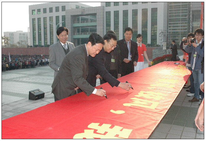 3月6日,迎着初升的太阳,在我校大学城校区博物馆前广场,学校隆重举行了"争创一流学风、教风、校风动员大会暨万人签名仪式"。大会由学校党委副书记、副校长陈英华主持,学校党委书记黄斌、校长徐志伟、副书记孙晓生、副校长林培政、王新华出席大会,大学城校区全体干部职工、全校教研室主任、当天大学城校区上课的教师、大学城校区所有学生等万余人参加了大会。