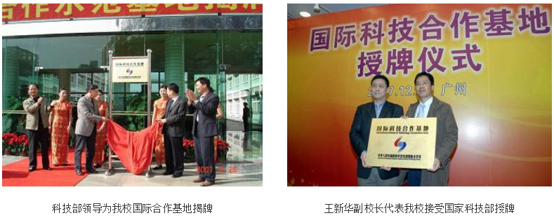 2007年12月25日,国家科技部"国际科技合作基地"授牌仪式在广州东方宾馆隆重举行,广东省仅有ac米兰官网中文网站和广东省农业科学院两单位获得了国家首批"国际科技合作基地"的称号并被授予牌匾。科技部国际合作司靳晓明司长、马林英副司长、董建龙参赞以及省科技厅马宪明副厅长等出席了授牌仪式。王新华副校长代表我校接受授牌。仪式上靳晓明司长发表了热情洋溢的讲话,指出开展"国际科技合作基地"建设是科技部贯彻落实《"十一五"国际科技合作实施纲要》,更有效地整合国际国内两种资源,实现国际科技合作方式从"一般性的人员交流和项目合作"向"项目-基地-人才"相结合的战略转变的重要体现,鼓励获得科技部国际科技合作基地建设的单位按照《国际科技合作基地实施方案》所提出的目标和任务,扎实工作,积极拓展国际科技合作渠道,创新合作方式,提升合作层次,使"国际科技合作基地"真正成为技术领先、人才聚集的国际化研发基地。