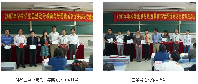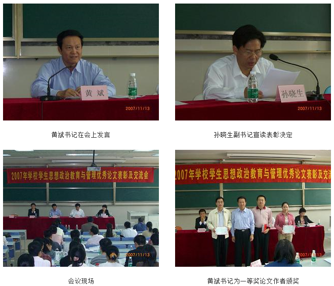 会议由学生处林彬处长主持。会议首先由学校党委孙晓生副书记宣读《关于表彰2007年ac米兰官网中文网站学生思想政治教育与管理优秀论文的决定》。本次参评论文共45篇,主要涉及大学生思想政治教育与管理的理论与应用研究,经过七位校内专家的评审,最终评出一等奖3篇,二等奖6篇,三等奖10篇。会上,各级领导分别给获奖作者颁奖并由获得一等奖的作者在会上进行了大会交流。随后由马定科校长助理代表评审专家组,对参评文章进行了细致的点评。马助理从本届参评论文的质量、论文的研究范畴以及论文的文笔功底等方面进行了点评,使论文作者清楚地了解了文章所存在的不足和撰写文章的基本要领。大会最后由党委黄斌书记和孙晓生副书记作总结讲话。黄书记在总结中强调我们思政工作者首先要提高认识,统一思想,切实把加强辅导员队伍建设这项政治任务抓实抓好;其次要立足当前,着眼长远,健全辅导员队伍建设的领导管理体制、工作机制和政策保障机制;要建立学院党政"一把手"领导责任制,把辅导员队伍建设状况作为评估考核学院工作的重要指标,作为学院领导干部业绩考核的重要内容;要健全辅导员选聘、培养、发展、管理机制,鼓励优秀辅导员攻读思想政治教育硕、博士学位,加强培训,促进辅导员骨干队伍向职业化、专家化方向发展,畅通辅导员流动渠道,既吸收优秀人才从事辅导员工作,又积极向其他岗位推荐、输送辅导员,搭建辅导员队伍发展的"立交桥";同时指出,要牢记责任,不辱使命,不断提高辅导员工作水平,以社会主义核心价值体系为根本和导向,组织和指导学生开展多种形式的思想政治教育活动;最后他希望辅导员队伍能不断提高思想政治素质、不断提高专业技能、严格遵守组织纪律、培养良好工作作风,以马克思毛泽东思想、邓小平理论、"三个代表"重要思想为指导,全面贯彻落实科学发展观,为加强和改进大学生思想政治教育,促进高等教育事业持续健康发展,为学校的建设作出新的更大贡献。孙书记的讲话中对此次参评论文的质量作出了肯定,并希望能有更多的思政工作者、行政管理者能参与到其中,真正实现大学生思想政治教育的全员参与;另外他还指出,我校思政工作者的课题研究要注意立足现实问题,减少战略层面的模糊理论研究,增强战术层面的实用应用研究,为把我校思政工作推向一个新的高度而不懈努力。