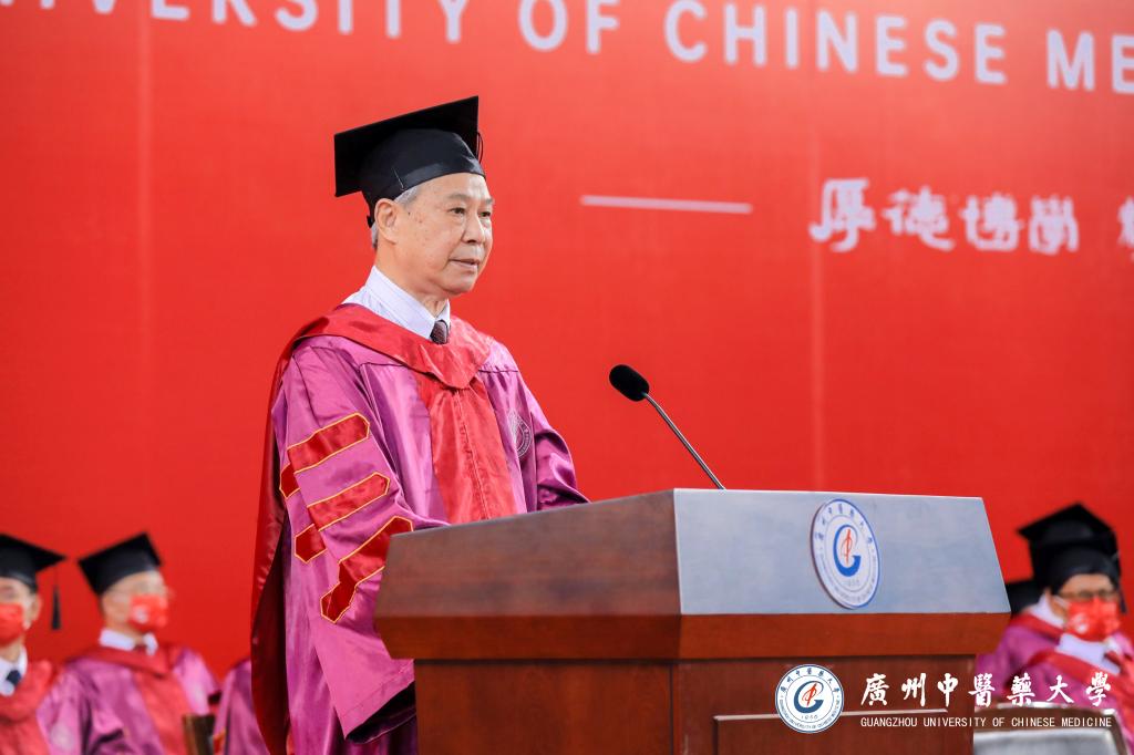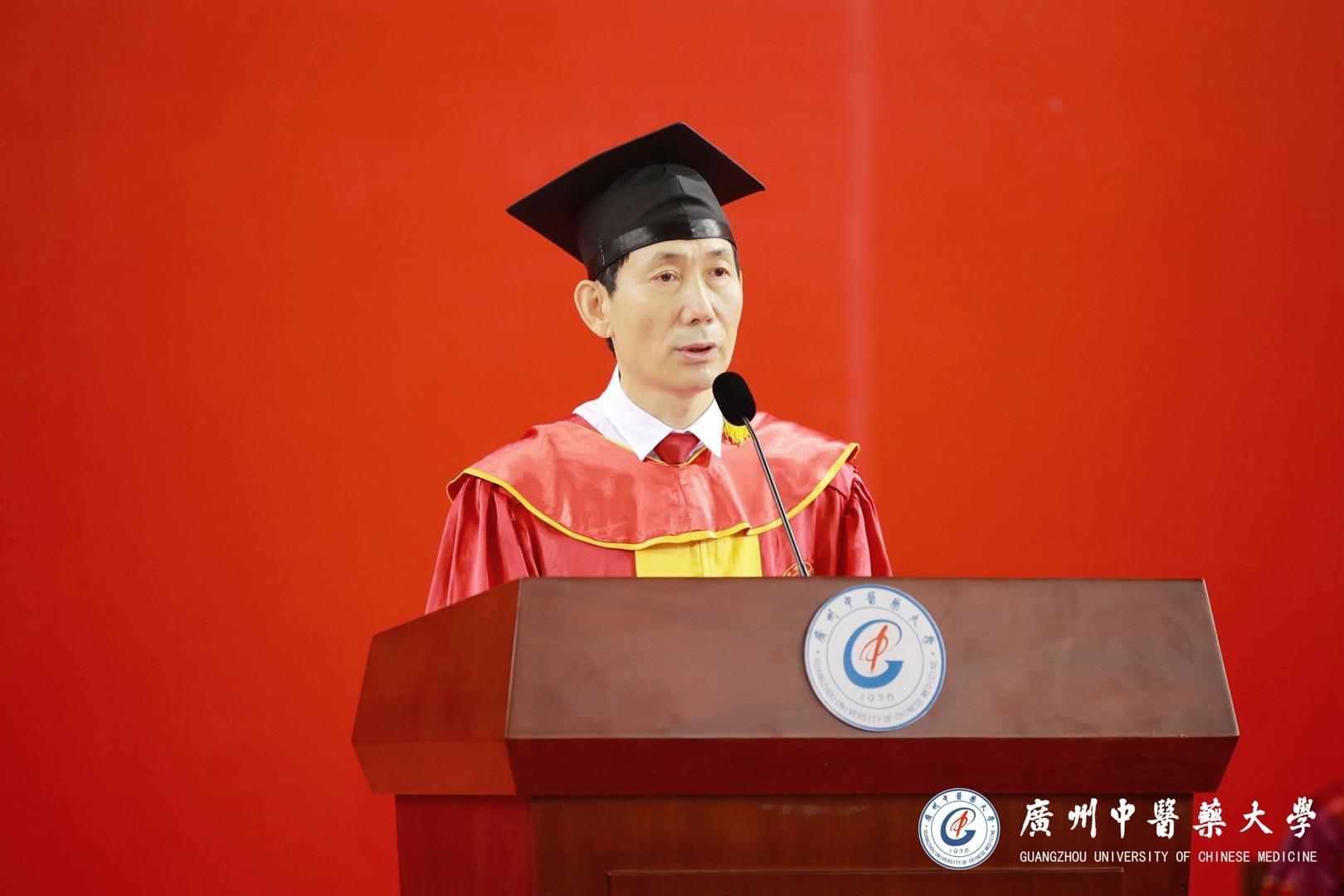 校长王伟以《胸怀“远志”,背挺“龙骨”,奋进当“苁蓉”》为主题发表致辞,带领学子们回顾了在校期间亲身经历的学校建设发展成就,并为学子们送上一份“路路通”锦囊,勉励莘莘学子怀揣远大志向,奋斗奔赴远方。他勉励同学们要胸怀“远志”奔前程,躬身于滚滚潮流之中,始终心怀“国之大者”,把爱国之情、强国之志、报国之行统一起来,把个人的理想追求融入党和国家事业之中,于每个平凡岗位中勤耕深种,在祖国的广阔舞台施展才干、实现梦想。他寄语同学们要背挺“龙骨”有担当,以实现中华民族伟大复兴为己任,增强做中国人的志气、骨气、底气,坚定中医药文化自信,把握中医药振兴发展天时地利人和的大好时机,昂首向前,守正创新,努力讲好中医药故事、传播中医药文化、展示中医药文化魅力,为推进健康中国建设和增进人民健康福祉作出新的更大贡献。他鼓励同学们要砥砺奋进当“苁蓉”,坚定信仰、信念、信心,面对困难挫折愈挫愈奋、愈战愈勇;培养创新意识,善于发现问题,敢于提出问题,努力解决问题,扩大认知地图,不断创新;勇于实践,将书本理论融入实践,在反复实践中总结经验,寻找规律,提升个人能力和素质,提高专业技能,更好为人民服务。他代表学校殷殷叮嘱毕业学子:“你们永远是广中医视如珍宝的孩子,母校永远都在这里,满怀期待与祝福,欢迎学子们常回家看看!”