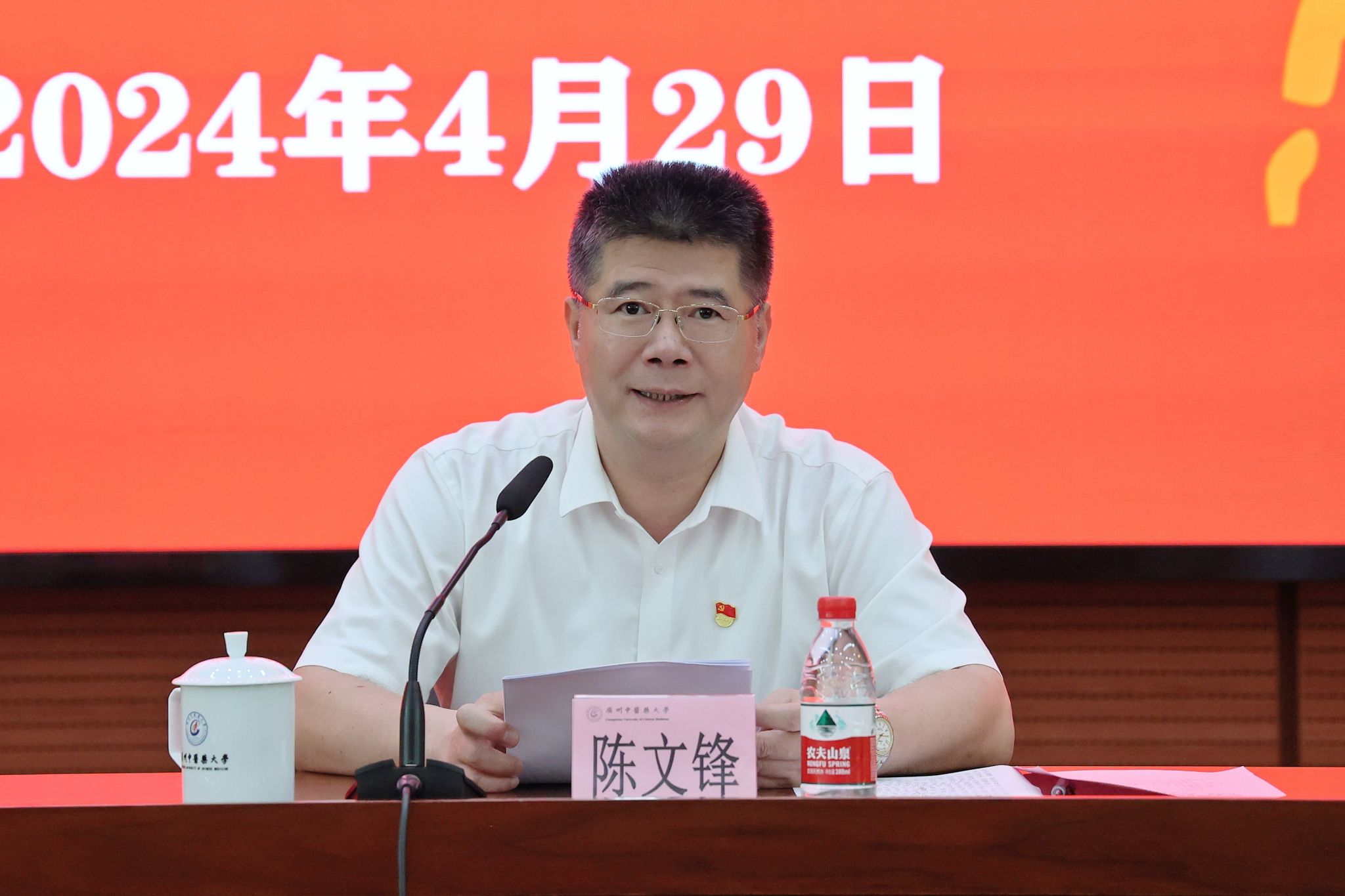 4月29日上午,学校举办党纪学习教育专题读书班开班第一课、党委理论学习中心组(扩大)学习会、中层干部任职能力提升培训第一课暨“先觉学堂”干部教育培训第十五课。学校党委书记陈文锋主持并讲授专题党课。