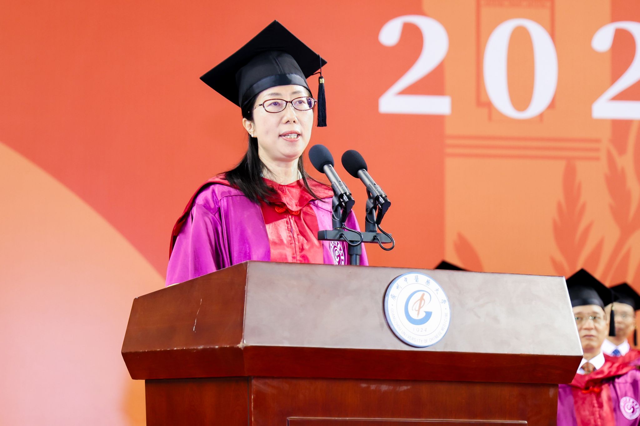 1999届校友、现任深圳市中医院急诊科负责人刘禹翔医生作为校友代表发言。她曾获得“广东省劳动模范”称号,中国农工民主党中央委员会“抗击新冠肺炎疫情先进个人”,“深圳市优秀医师”,也是第二届“深圳医师奖”获得者, 2023年入选首批鹏城岐黄工程深圳市中医药领军人才支持项目。她与毕业生分享几个建议:一是坚持学习,多读经典,多跟名师,多实践,多思考,留心钻研,一门深入掌握医学的精髓;二是秉承医德,用医术和医德去赢得患者的信任和尊重;三是勇于创新,在继承传统的基础上,敢于尝试新的治疗方法,把中医理论和现代科学相结合,赋予中医更强的生命力;四是保持谦逊,时刻保持谦逊的态度,虚心向他人学习,不断完善自己。