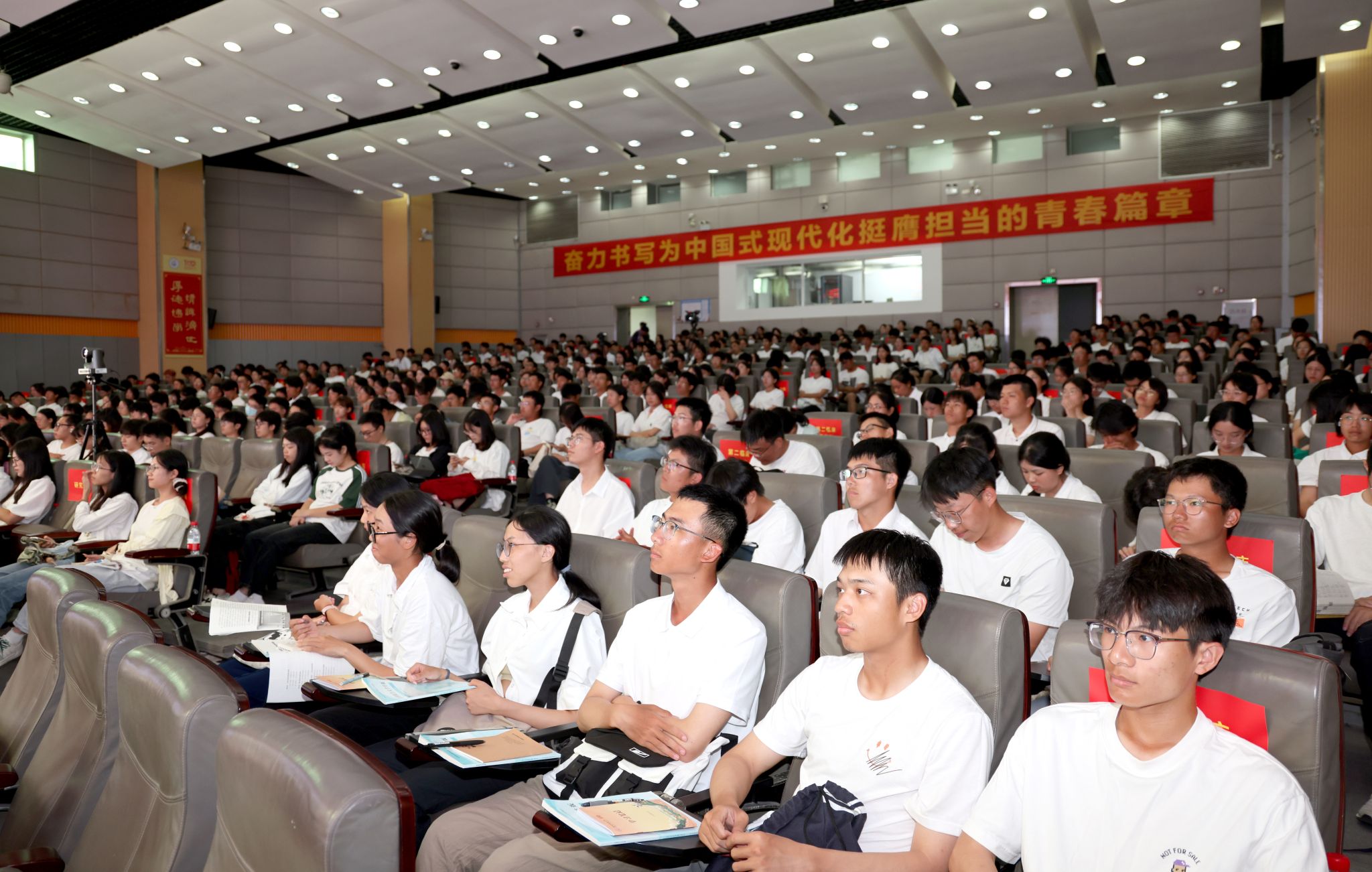 近6000名2024级新生通过线上线下的方式共同聆听。学校各相关职能部门、二级学院负责人,辅导员代表、思政课教师代表参加。