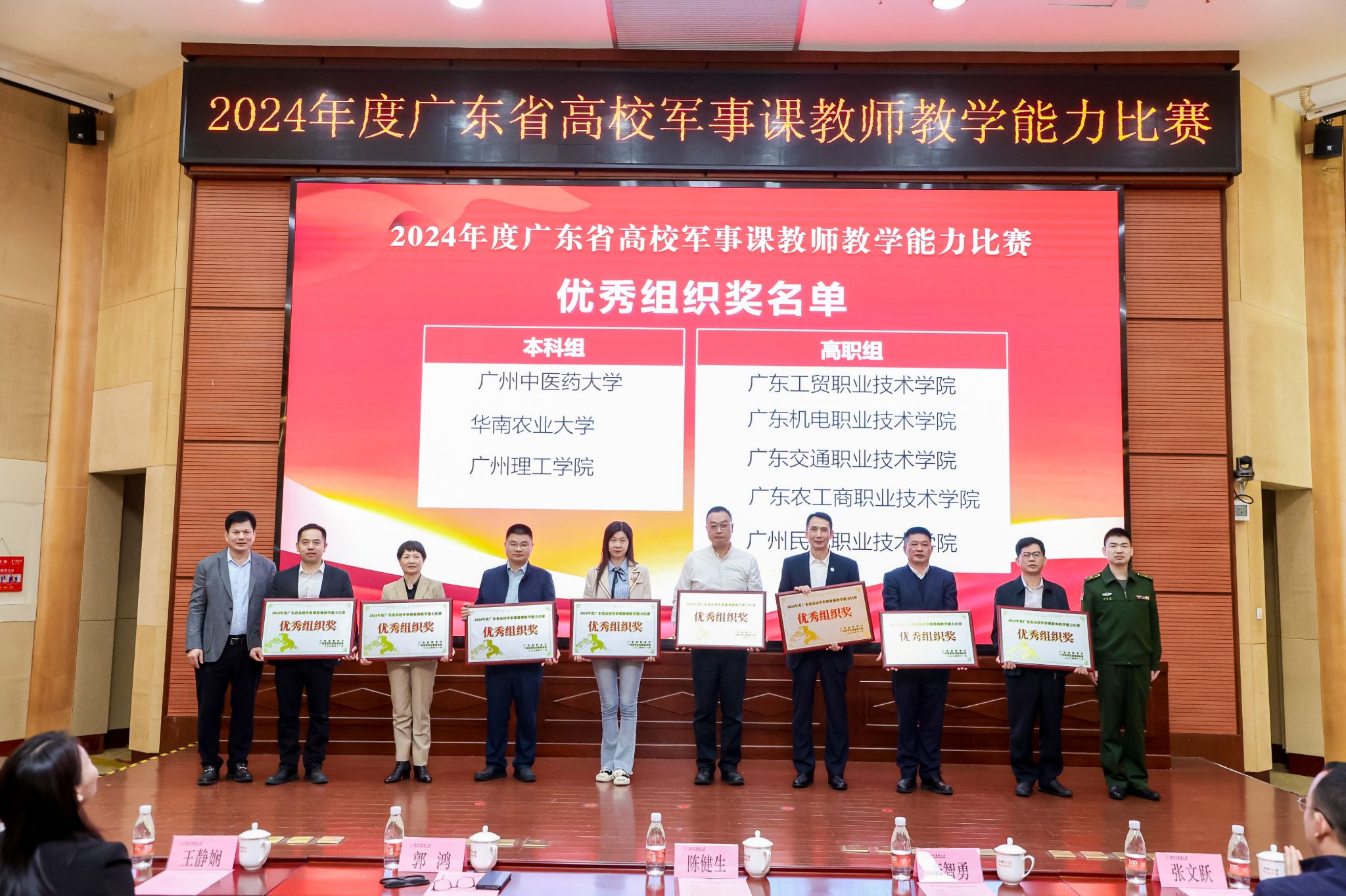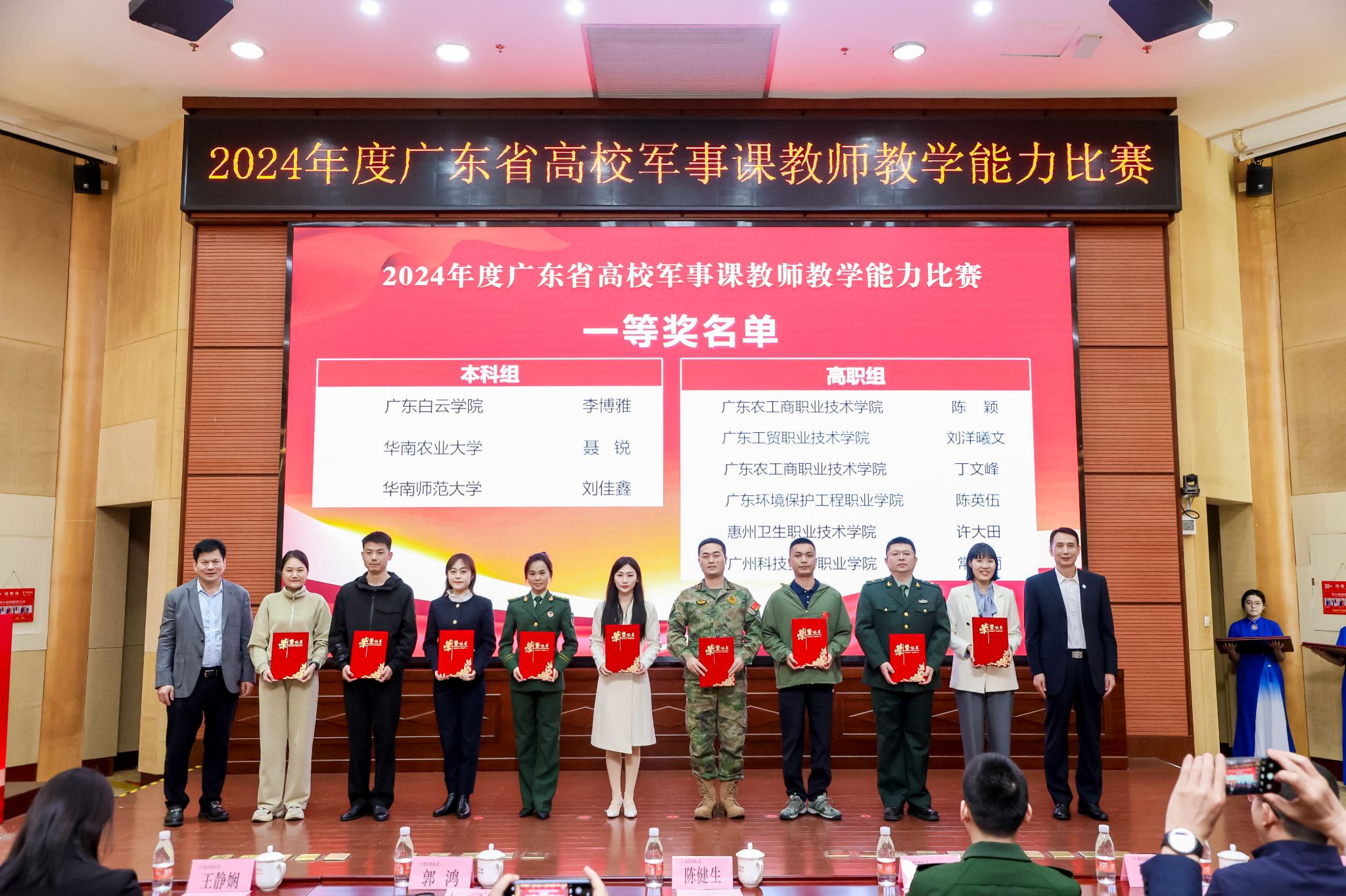 12月1日晚,2024年度广东省高校军事课教师教学能力比赛(决赛)颁奖仪式在我校大学城校区举行。广东省教育厅二级巡视员陈健生,广东省教育厅体育卫生与艺术教育处处长王静娴、副处长张文跃,广东省军区战备建设局少校营级正职参谋李智勇,ac米兰官网中文网站党委常委、副校长郭鸿,各评委组组长、参赛选手和学生代表出席颁奖仪式。学校保卫部(武装部)部长温祥彬主持仪式。