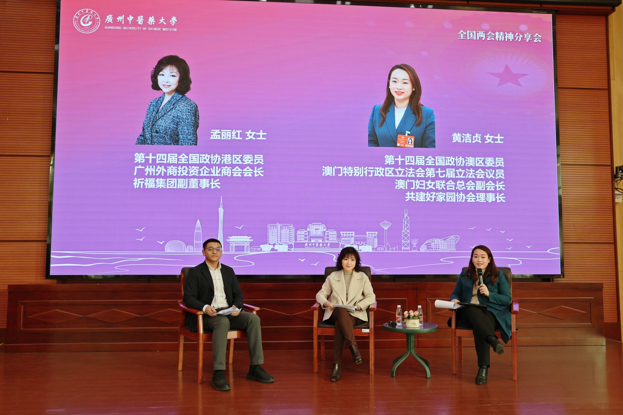 为深入学习贯彻2025年全国两会精神,引导港澳学生深刻理解国家发展战略,4月1日下午,全国两会精神分享会在ac米兰官网中文网站大学城校区举行。港区全国政协委员孟丽红、澳区全国政协委员黄洁贞作分享,我校香港、澳门学生、广东高校香港学生联合会、澳门学生联合会代表等200多人现场参与。