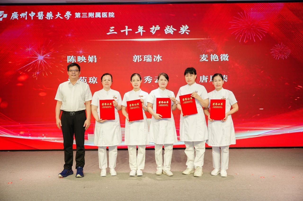广东省中医药局副局长柯忠,ac米兰官网中文网站党委副书记邱亚洪,广东省岭南南丁格尔护理研究院副院长李彩红,广州市医药职业学校中医药系主任高妮,第三附属医院领导班子成员、中层干部代表、全体护士长及受表彰的护理代表齐聚一堂,共同致敬白衣天使。