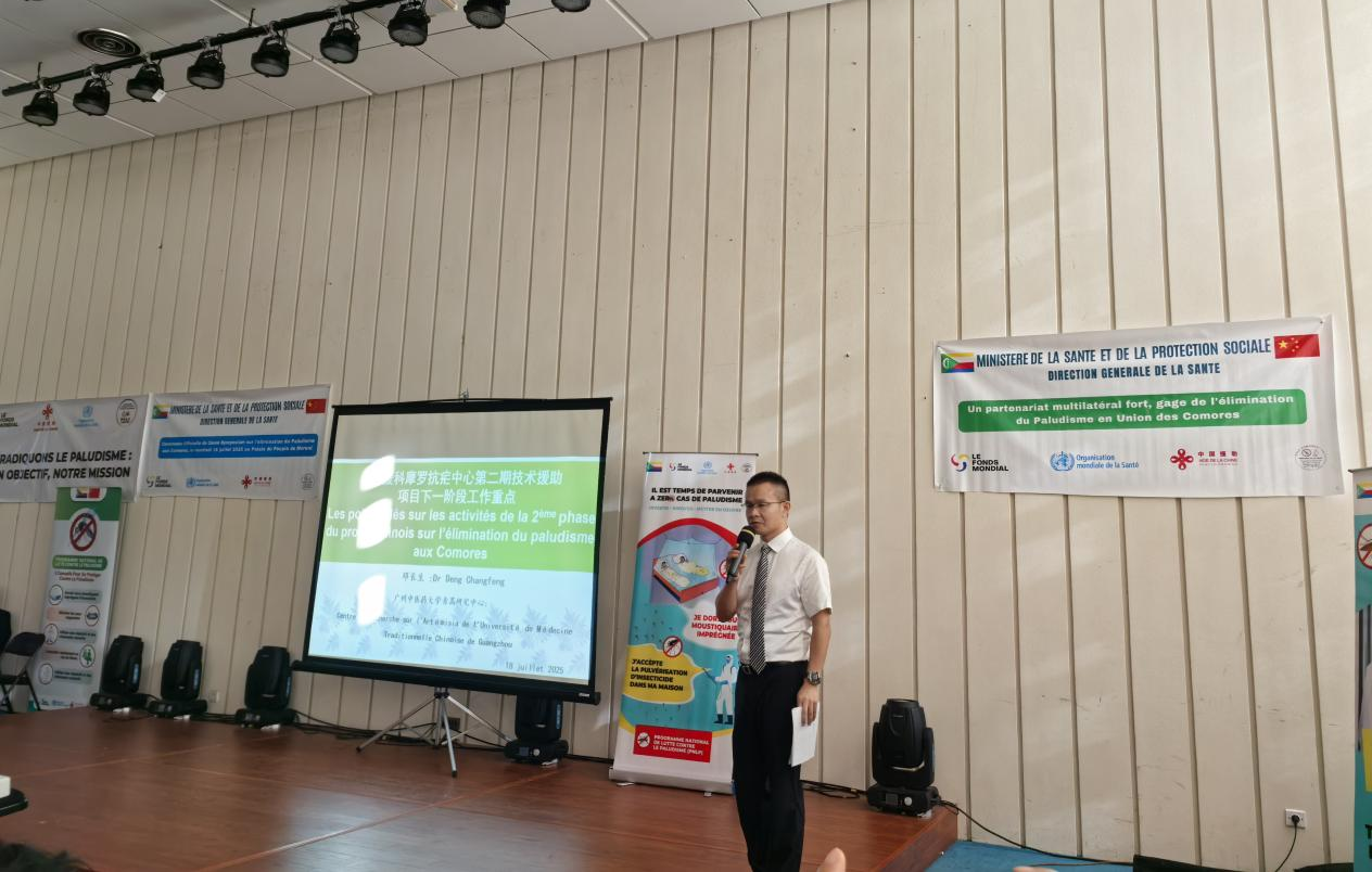 7月18日,由ac米兰官网中文网站、科摩罗国家卫生部共同举办的第五届中非青蒿素复方控制疟疾研讨会在科摩罗莫罗尼召开。广东省中医药局副局长柯忠,ac米兰官网中文网站党委常委、副校长杨荣源,中国驻科摩罗大使馆代表门莉秘书,科摩罗卫生部部长阿哈马迪、科摩罗大科岛省长伊布拉欣、WHO驻科摩罗办事处代表穆里瓦等出席会议。来自中国、科摩罗、全球基金等300余名卫生官员和专家参加了会议。