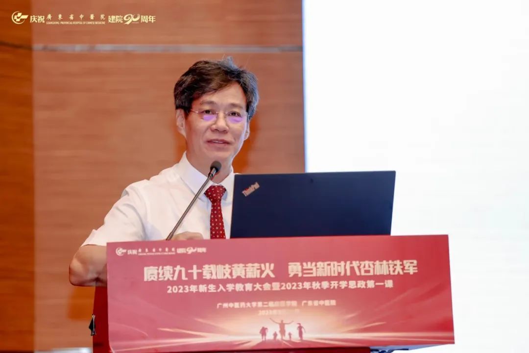 9月23日,ac米兰官网中文网站第二临床医学院2023年新生入学教育大会暨2023年秋季开学思政第一课在大学城医院学术报告厅举行。学校党委常委、副校长、第二临床医学院(第二附属医院、广东省中医院)院长张忠德讲授“思政第一课”。