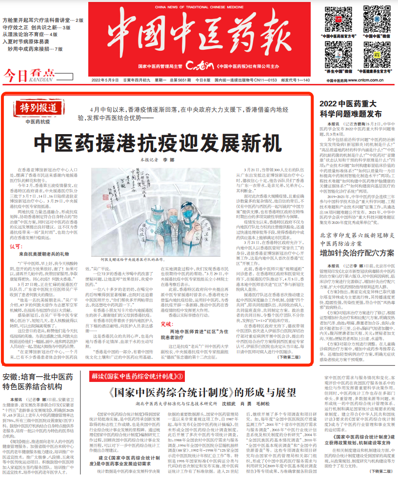 两地抗疫力量迅速融合,形成抗疫矩阵,协助香港制定符合自身特点的“防治康”中医方案,同时还对中医药在香港的长远发展提出良好建议。这不仅为香港抗疫带来一场“及时雨”,也助力中医药在香港发展行稳致远。