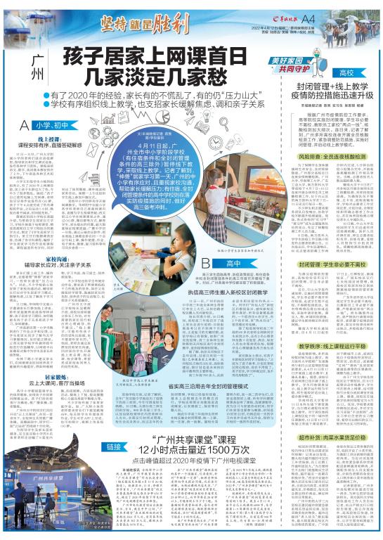 由于广州大学桂花岗校区位于管控区,自10日起便启动在线教学,任课教师居家在线教学,学生可在宿舍在线上课,也可按指引分批分流到课室在线上上课。据悉,该校区在线教学结束时限暂定至4月15日。在此期间,学校要求暂停跨校区流动,并对学生实习采取不动原则:在实习单位住宿的实习继续、暂停早出晚归的实习、暂停外出实习的审批。