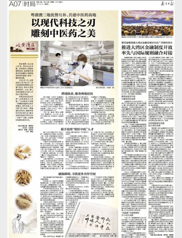 广东省中医院副院长卢传坚认为,广东中医药基础雄厚,群众对中医药服务需求大,开展临床研究有资源优势,而香港和澳门在中医药研究领域的优势主要是药物作用机制和创新新药研发。“三地携手合作,用国际前沿科技手段揭示中医药防病治病的科学内涵,并加快成果转化和产业发展。”卢传坚建议。
