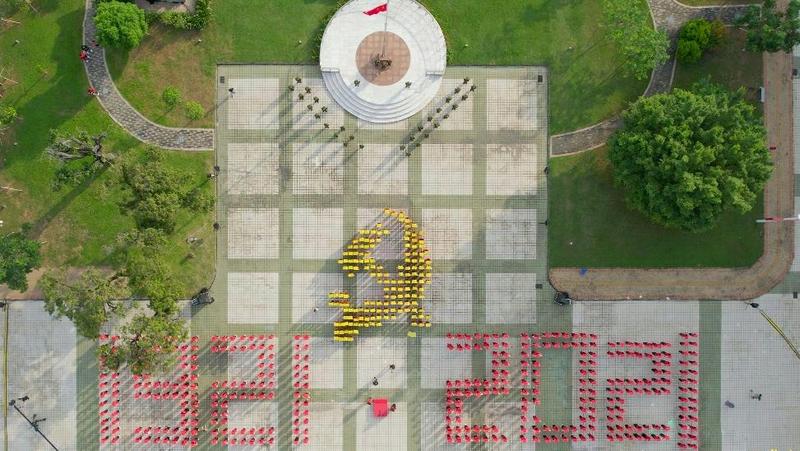 在她的带领下,在场师生再次把歌声献给党,《保卫黄河》、《团结就是力量》、《没有共产党就没有新中国》……一首又一首的经典歌曲饱含着百年的红色记忆,在歌声中,由广中医学生组成的方阵变换出“100”“1921”“2021”和党徽等图形,将现场气氛推至高潮。