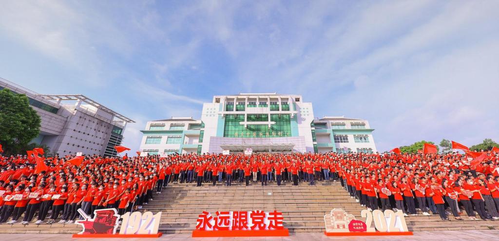 一首又一首的经典歌曲饱含着百年的红色记忆,嘹亮的歌声令所有人都沉浸其中。在歌声中,由学生组成的字操方阵随着音乐变换出“100”“1921”“2021”和党徽等图形,热烈庆祝中国共产党成立100周年。